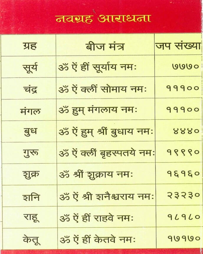 Strong planets are visible full night. Medium planets are visible for less than half night and weak planets are not at all visible or maybe visible for 3 hours or less; exception are Mercury and Venus (morning evening star) as they are visible only after sunset or before sunrise for less than 3 hours only, whenever visible. Blood pressure, sugar, cholesterol should neither be high nor low. Similarly planet pressure should neither be high nor low. Pressure must be normal. During full moon, moon, pressure is high and it's low in new moon. Retrograde planets visible full night indicates high pressure and set planet, not at all visible indicates low pressure. A planet in normal forward motion indicates normal medium pressure and health. High or low pressure planets indicate problems of the house and sign they rule. For example: full moon in the first house in cancer sign indicates headache and mental problems. To reduce negative effect of planets we have to wear that planets ratna, Rudraksha, yantra and read, write, recite or listen mantra 108 times given in Navagraha aradhana chart below.