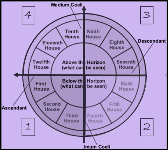 Horoscope House Number and Direction : 1st House Ascendant = East , 7th House Descendant = West , 10th House Medium Coeli = Up North Zenith , 4th House Imum Coeli = Down South Nadir